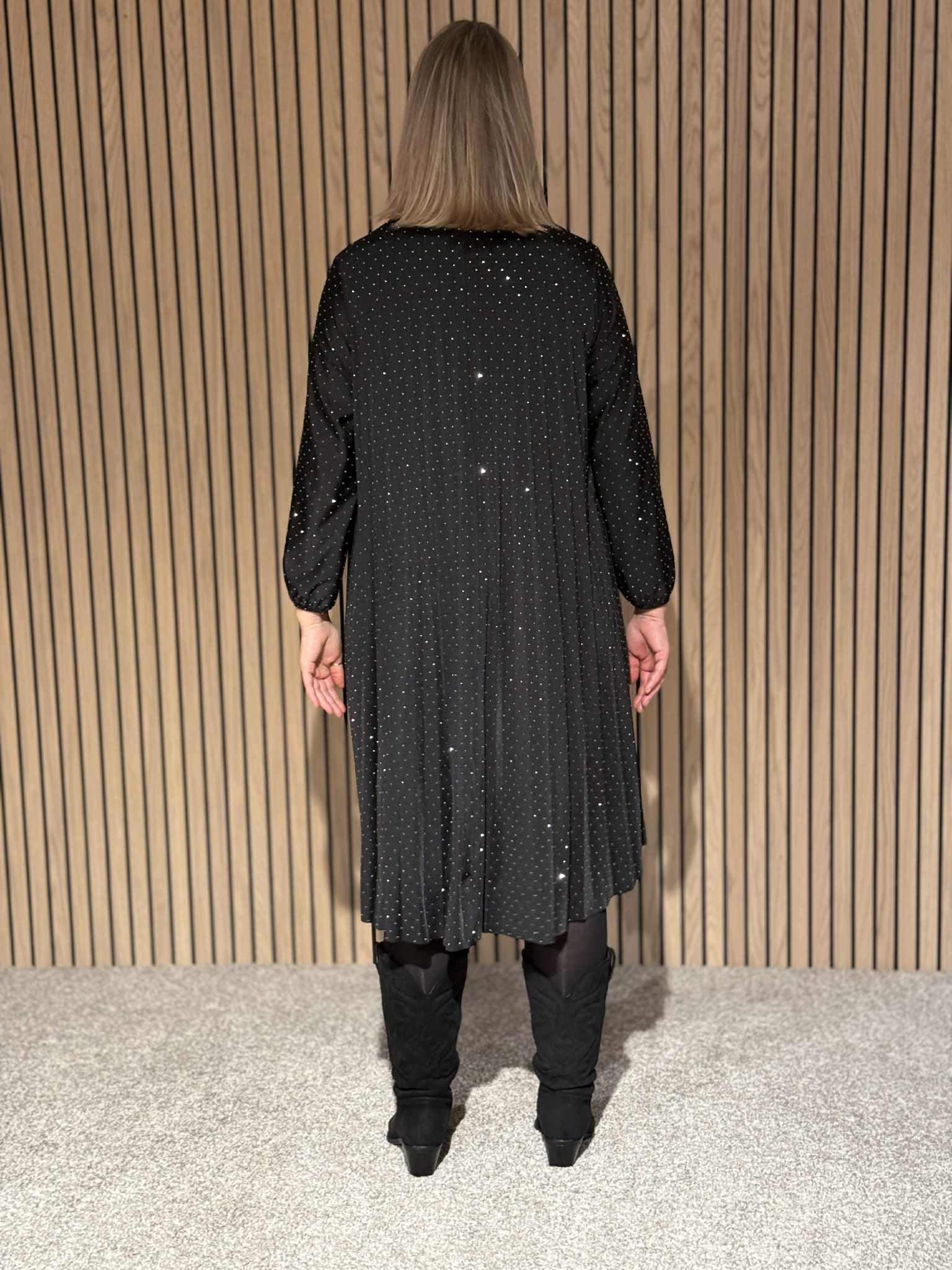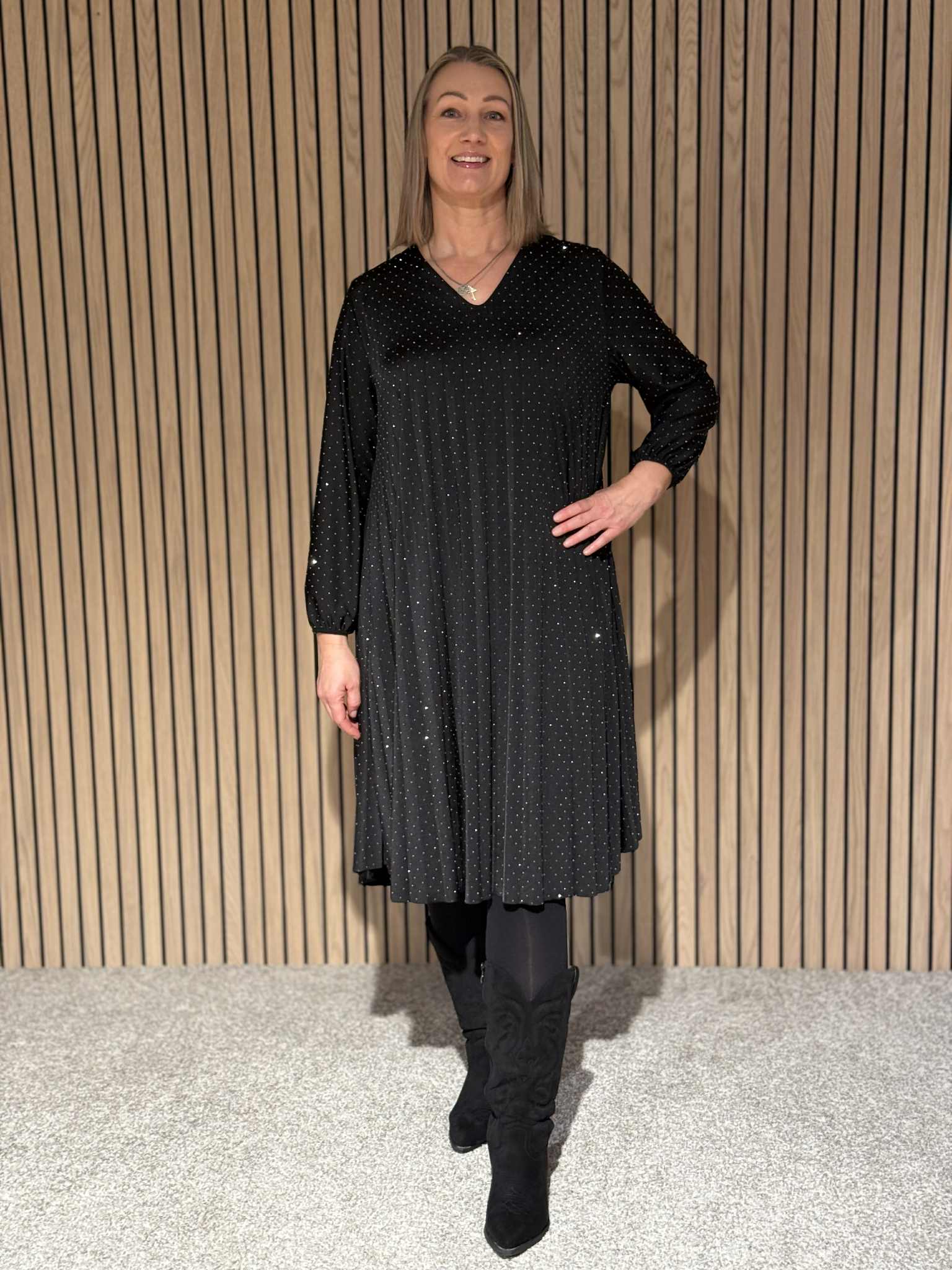 Lekker svart, foret og ledig kjole med små studs, v-hals,