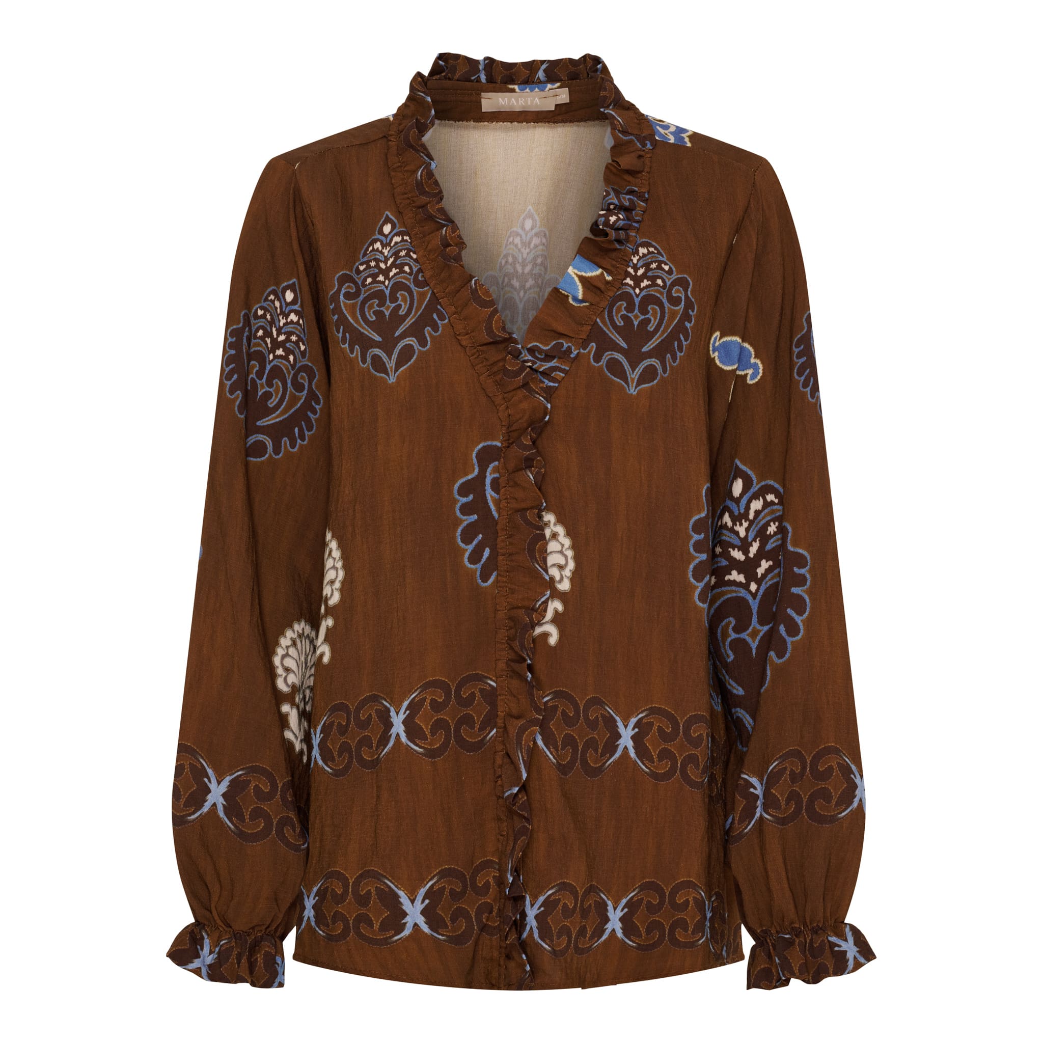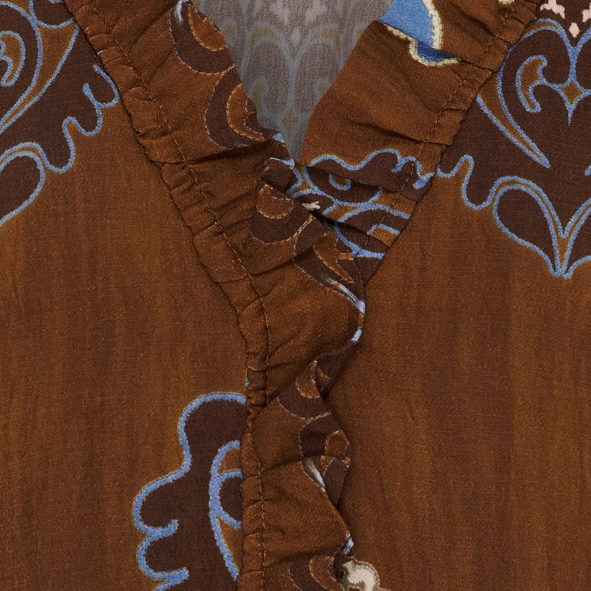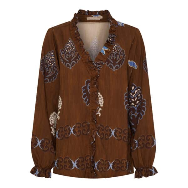 En kjempefin bluse i sjokoladebrunt, blått og beige farger,