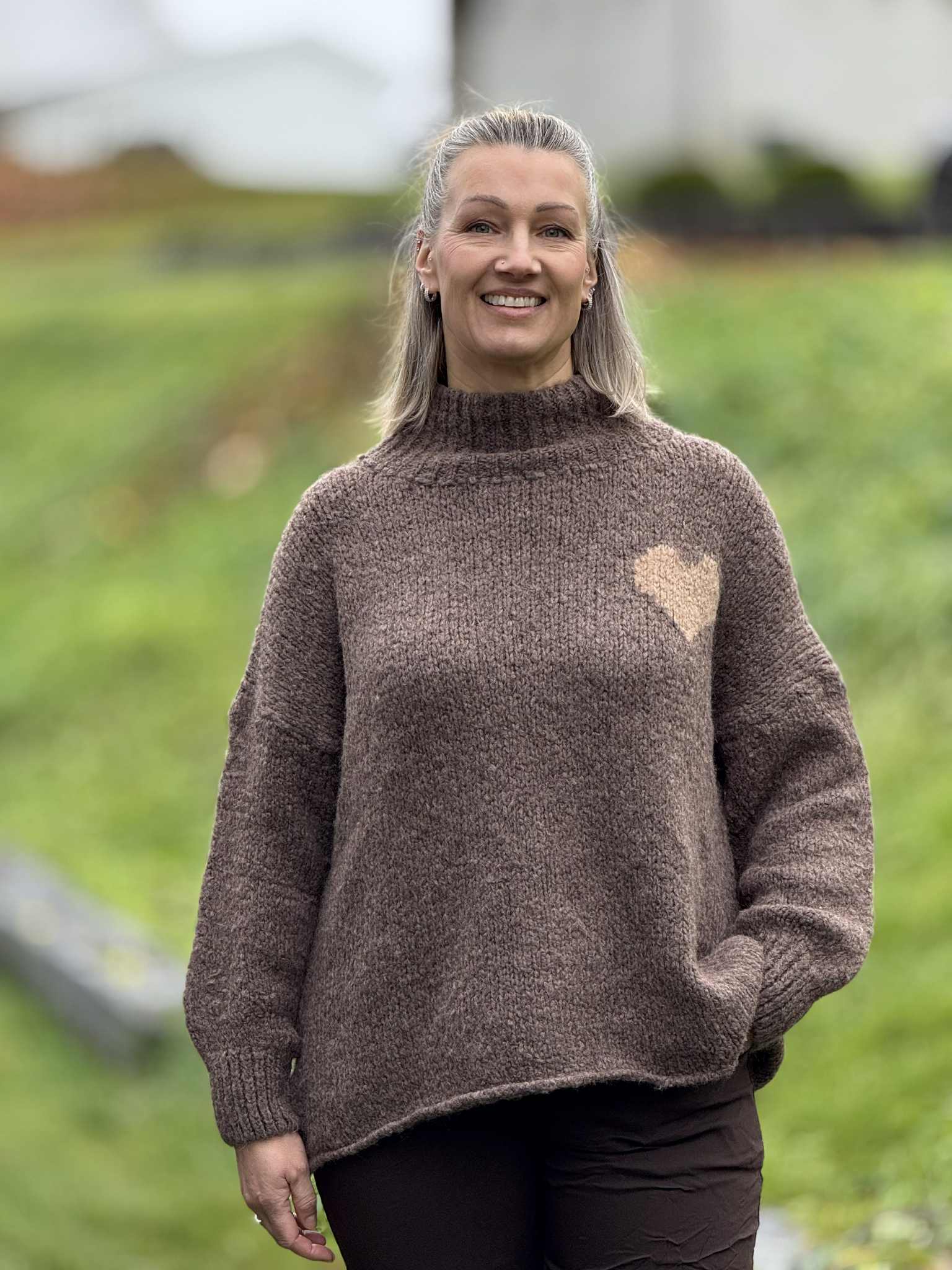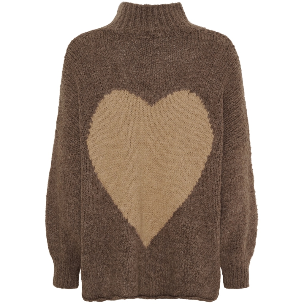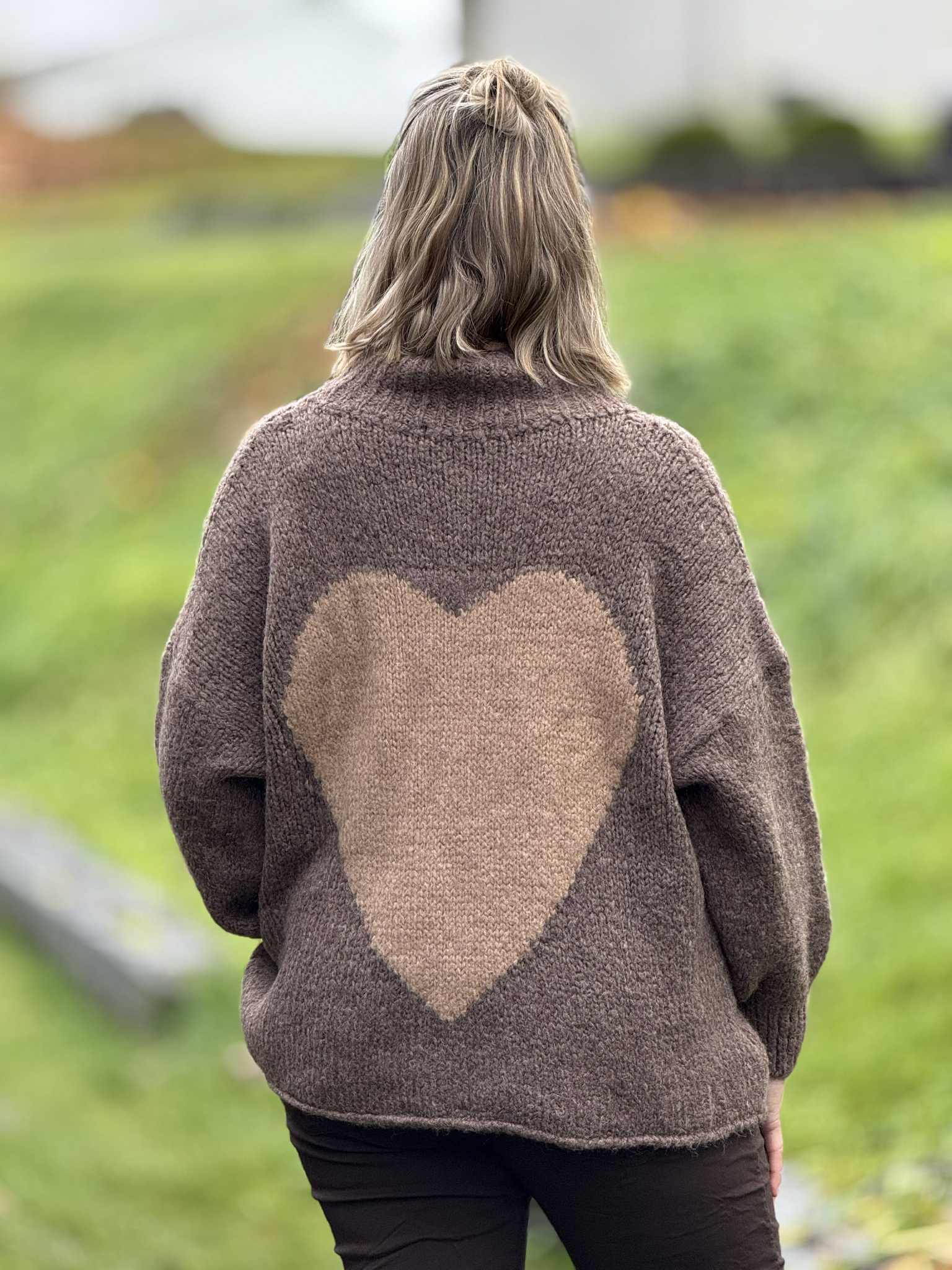 Superfin strikkegenser med et lite hjerte foran og et større bak.