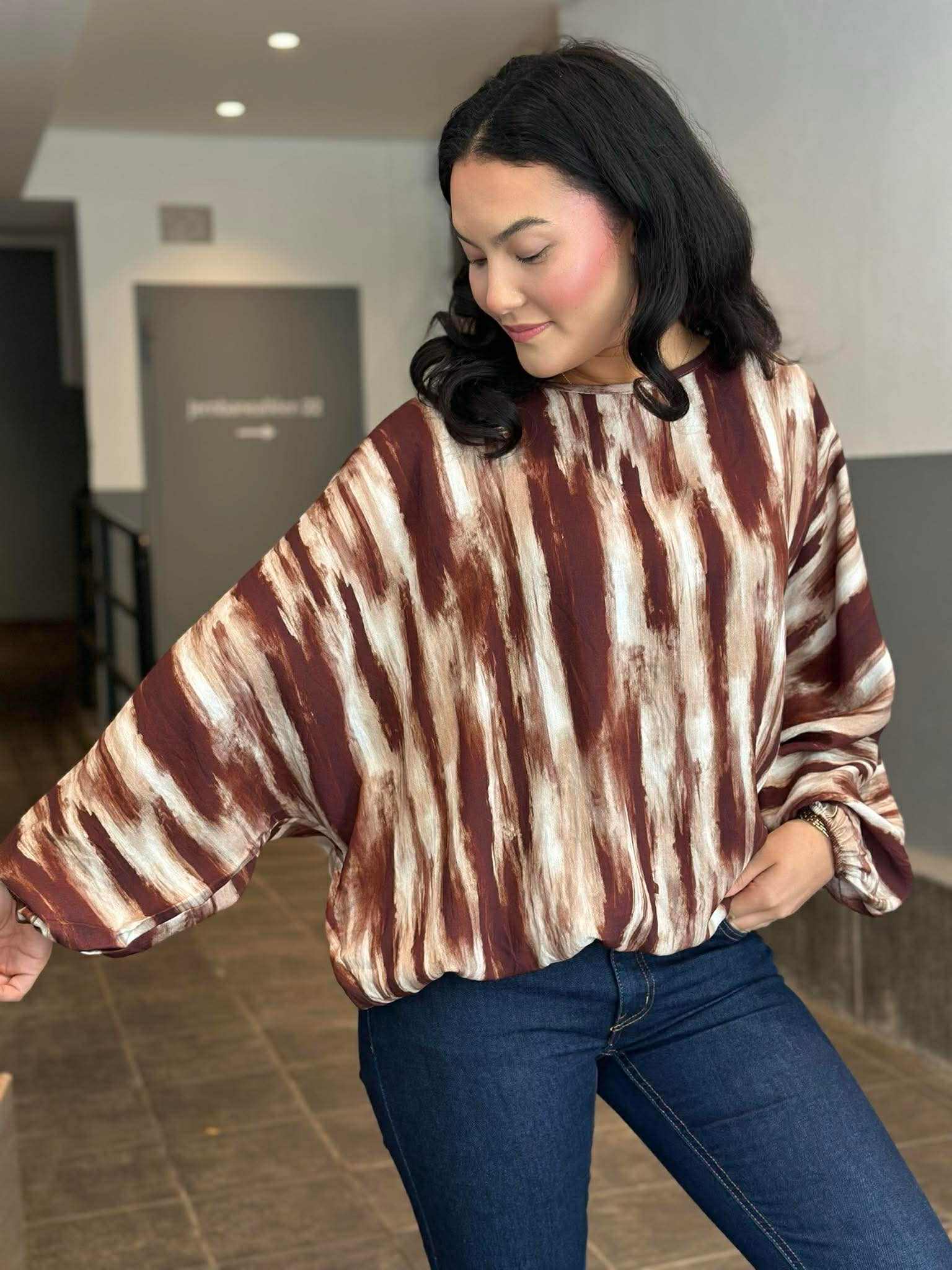 Blusa har flaggermusermer, strikk nederst og på strikk på ermen.