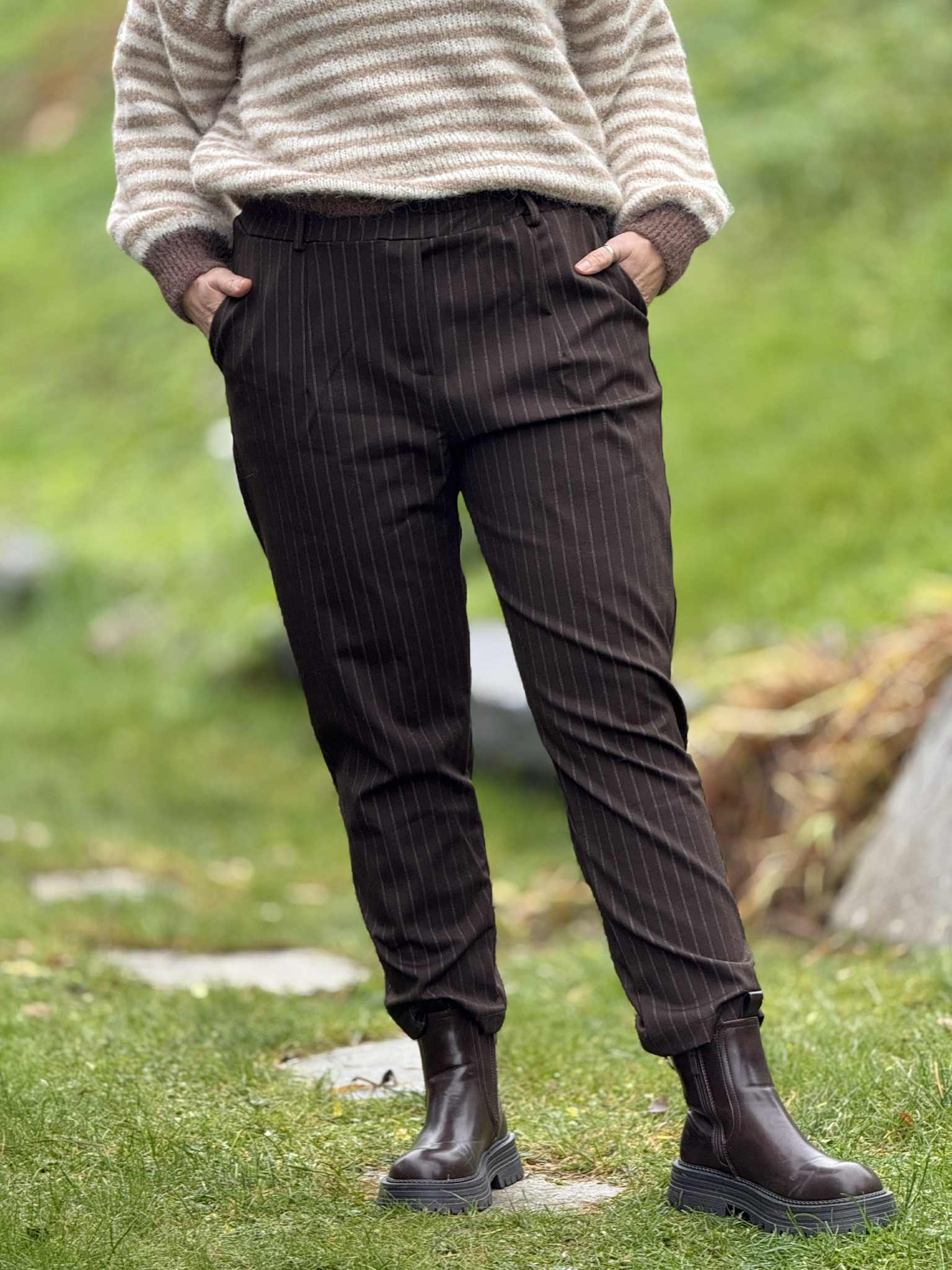 Kjempe komfortable bukser med pinstripe. Buksene har strikk i midjen og belte hemper.