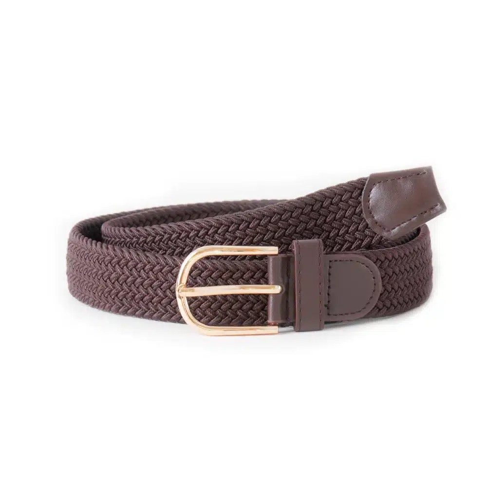 Brunt flettet belte med stretch,gull beltehempe, som kan pynte opp et antrekk.