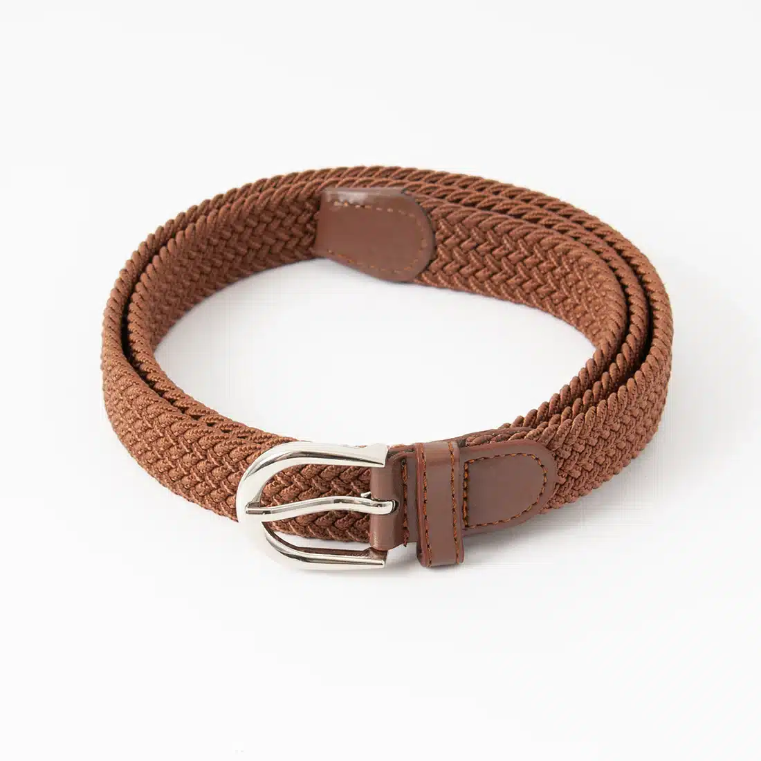 Flettet belte i fargen cognac, sølv beltehempe, med stretch, som kan pynte opp et antrekk.