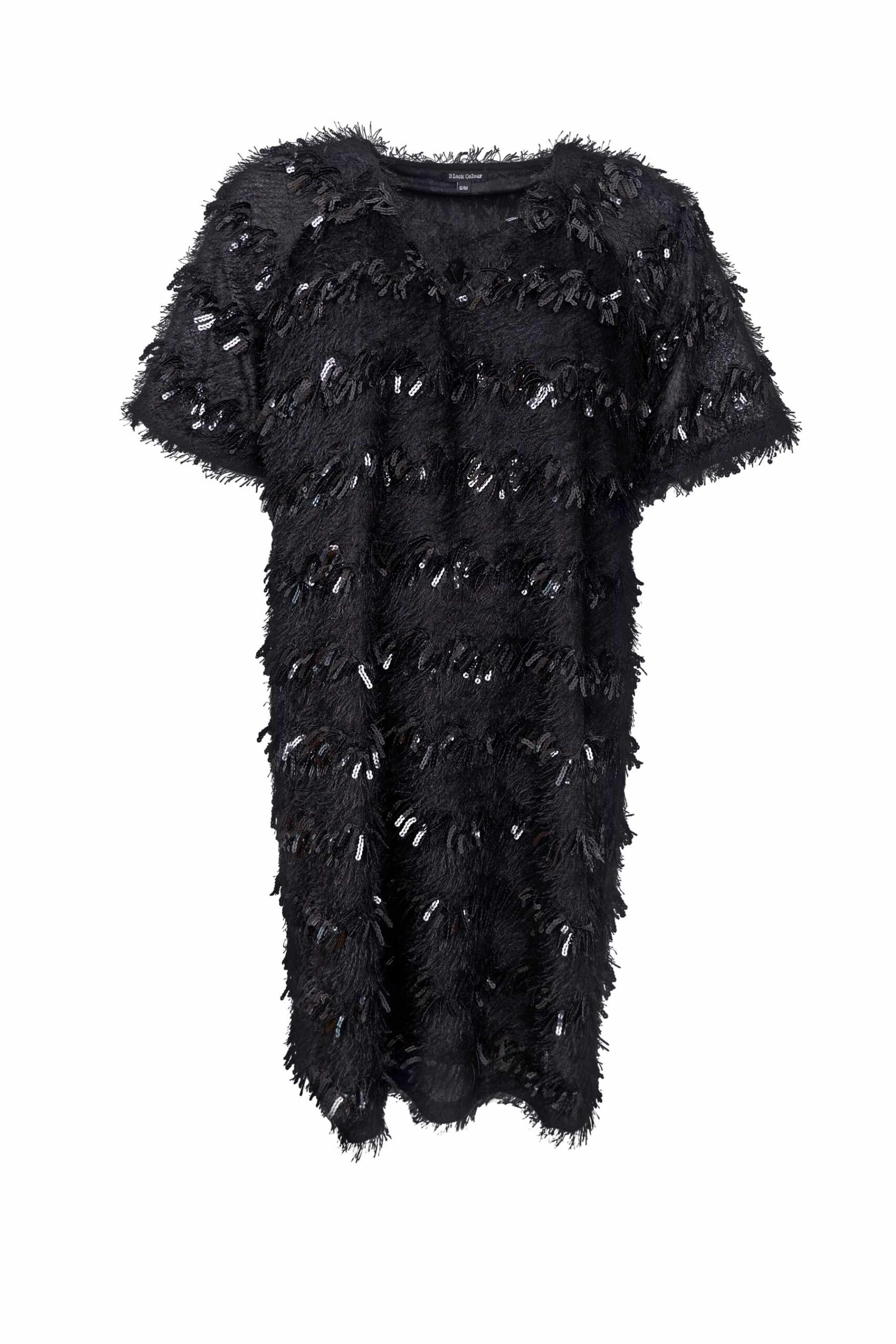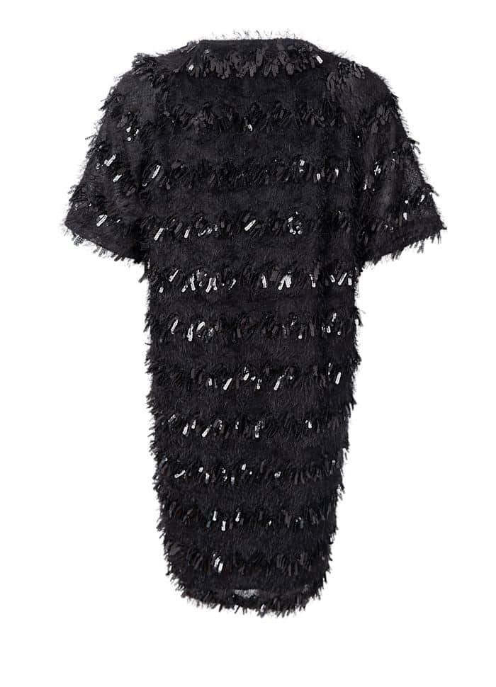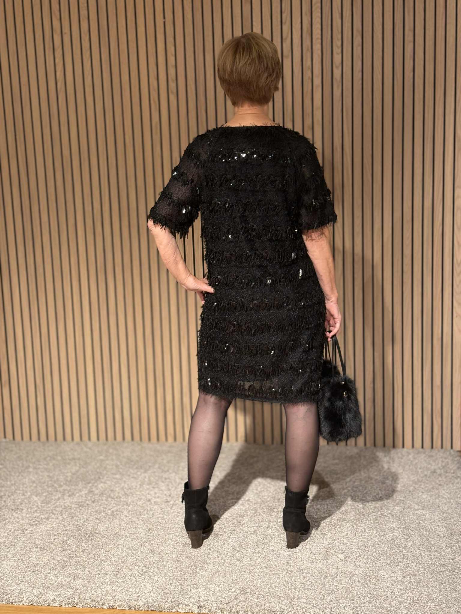 Rålekker kjole med v-hals,rett fasong,fin lengde på erm, knelengde, paljetter og små frynser.